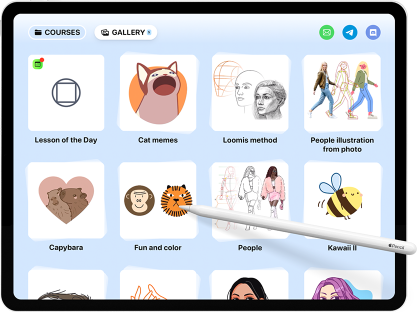 Explore ArtWorkout features: step-by-step tutorials, instant evaluation and full Apple Pencil integration. Accessible for artist of any age, gender or skill level.